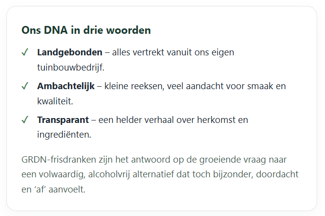 De rode draad blijft dezelfde: natuurlijk, eerlijk en puur. De frisdrankenlijnen zijn geen losstaand product, maar een verlengde van de velden, tuinen en teelten waarmee we elke dag bezig zijn.